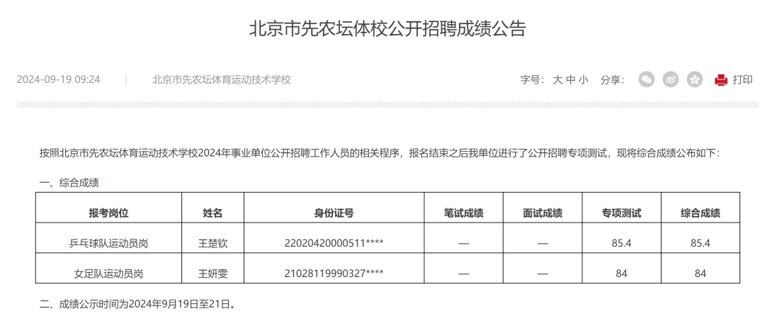 2024年10月28日,北京市体育局官网发布《北京市先农坛体育畅通时代学校2024年公开招聘拟聘请东谈主员公示》。