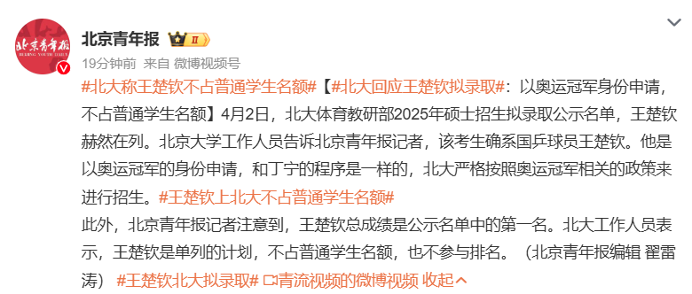 北京大学责任主谈主员告诉记者,该考生确系国乒球员王楚钦。他所以奥运冠军的身份肯求,和丁宁的款式是相同的,北大严格按照奥运冠军连系的策略来进行招生。