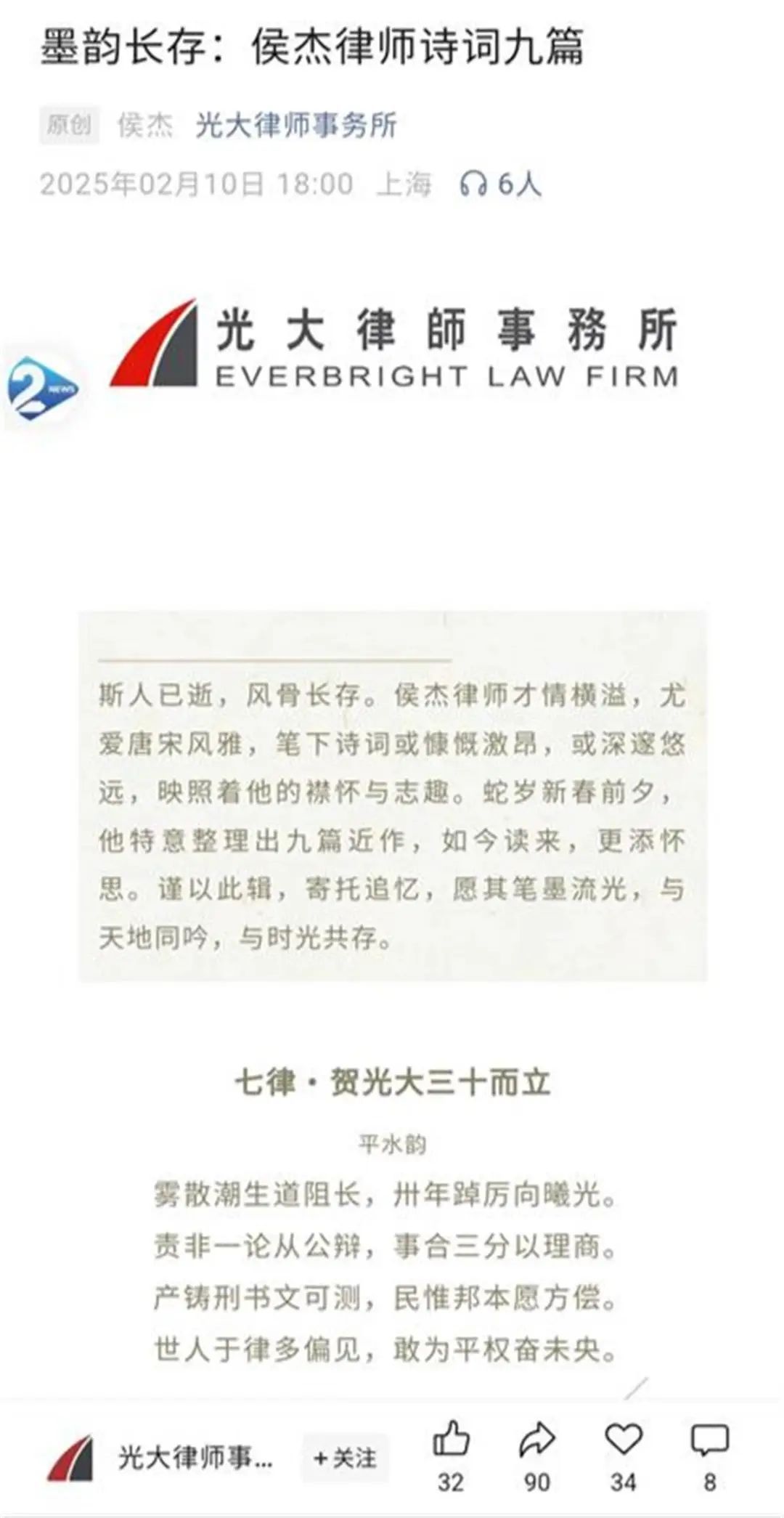 2月10日,上海市光大讼师事务所官方微信公众号发表了题为《墨韵长存:侯杰讼师诗词九篇》的著述。著述称:斯东谈主已逝,风骨长存。侯杰讼师才思横溢,尤爱唐宋致密无比,笔下诗词或伟姿飒爽,或艰深悠远,照射着他的胸宇与志趣。蛇岁新春前夜,他特别整理出九篇近作,如今读来,更添吵嘴念。谨以此辑,录用追想,愿其文字流光,与世界同吟,与时光共存。