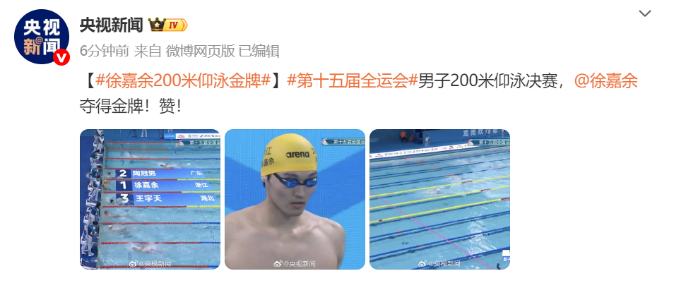 第十五届全运会男人200米仰泳决赛,徐嘉余夺得金牌!