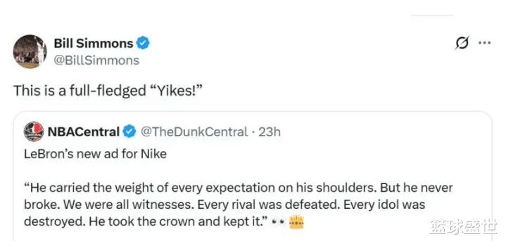 而这亦然耐克告白碰到争议的根源,很赫然,这则告白念念要唤起球迷关于詹姆斯的情感,但球迷们看到的,却是一个徐徐走到活命晚年的巨星,他的总揽力不再如巅峰那样无解,他的荣誉簿上照实有弥散多的光芒,但也有着太多缺憾了。