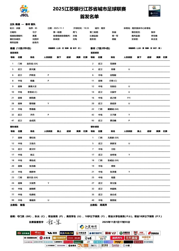 南通替补:23-蔡天龙、7-覃虹皓、12-王俊杰、14-蔡文轩、17-陈正、18-傅佳成、20-张浩楠、22-程薛坤、24-文俊秀、42-顾锦晖、77-包鼎铭、99-曹越涛