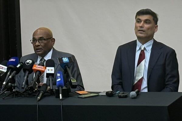 2026年3月16日,周一,亚足联布告长温莎·约翰(左)与其副手瓦希德·卡达尼在吉隆坡近邻举行的新闻发布会上发言。