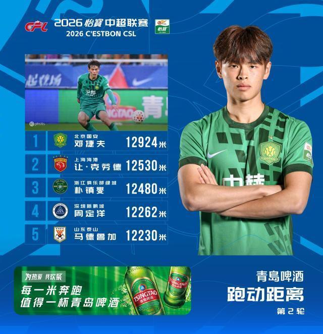 3月16日,中超联赛官方公布了第2轮联竞往还榜,18岁国安小将邓捷夫以12924米的跑动距离登顶跑动榜。